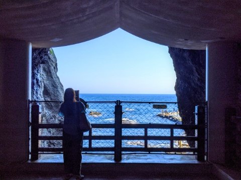 江の島岩屋の洞内は、第1岩屋と第2岩屋の2つの洞窟に分かれています。途中には、青空を切り取ったような人気のフォトスポットもあります。