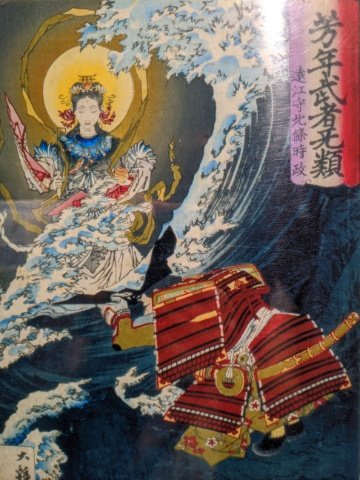 最後の夜、時政の目の前には、突如美しい女性が現れます。その女性は「汝の子孫は栄華を誇るが、政道に違うことがあれば滅びる」と言い残し龍の姿になって海の中へと消えて行きました。時政は祈りが届いたと喜び、そこに残った3つのウロコを家紋にしました。