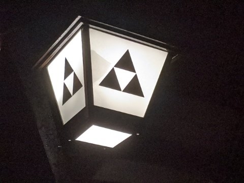 岩屋内に吊るされた紋章、こちらのトライフォースは北条家の家紋。江ノ島には、先ほどの五頭龍以外にも龍の伝説があり、それはこの家紋と深く関わっています。