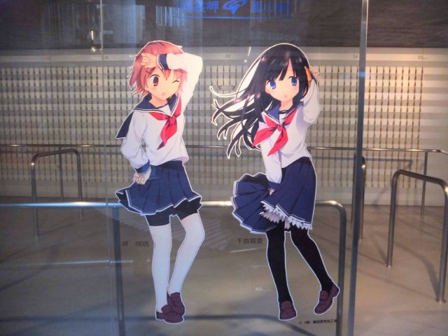 そんな強風体験の傍らには、ご当地萌えキャラのお二人。左側のショートのコが岬 襟萌(みさき えりも)ちゃん、右のロングヘアが千島 霧夏(ちしま きりか)ちゃんです。