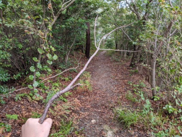 この山道は蜘蛛の巣がたっぷり。私はうっかり引っ掛かってしまったのですか、かなり丈夫な糸でなかなか取れません。落ちている木の枝を装備して、振りながら歩くと良いと思います。