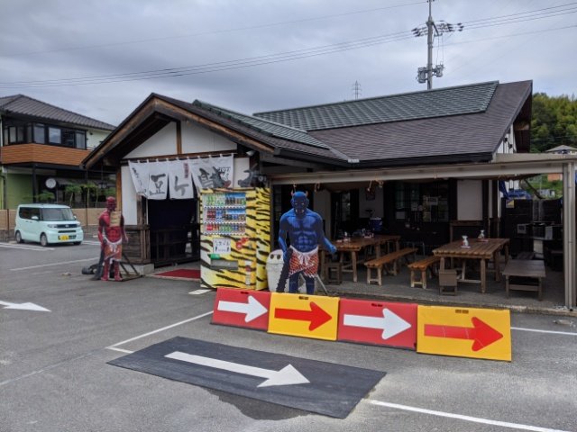 ユニークなお豆腐や大豆関連食品を扱う島のお豆腐屋さん。入口には仁王像の如き真っ赤なオニが立ちはだかり、インパクト抜群。