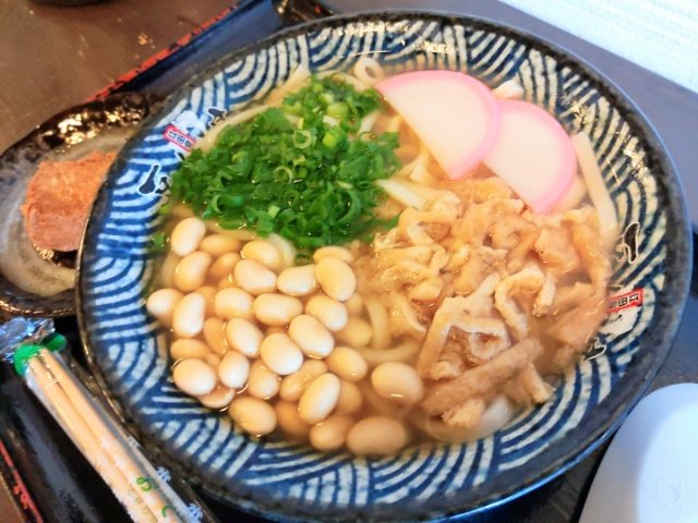 名物メニューは大豆うどん!甘口出汁のしこしこうどんの上に、大豆がびっしりと乗ったうどんです。やわからかく煮た大豆は、豆本来の甘みを感じます。おまけで付いていた絹の厚揚げも、サクサクとろとろでとっても美味しい!