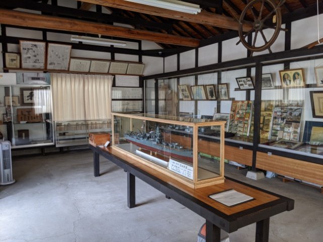 館内は一部屋だけのコンパクトな造り。1/100の軍艦利根の模型や、船内で使用されていた道具、乗組員の写真などが展示されています。基本的に無人なため、照明も自分でオンオフを切り替えるセルフスタイル。