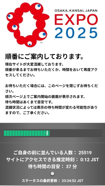 ここで要注意なのが、万博のチケットサイトが繋がらないことが多いこと。特に7日前抽選の結果が出る夜の22:00頃、そして3日前先着がスタートする午前0:00頃は大混雑!アクセスしようとすると、こんな待機画面に!