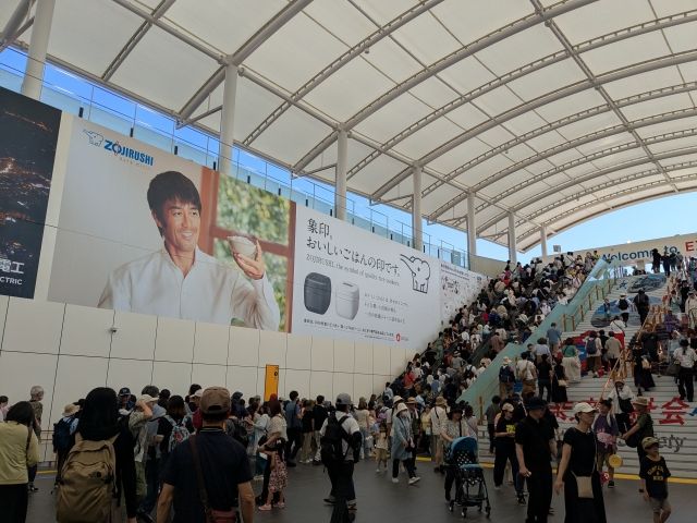 というわけで、迎えた万博初日。最初は夜間券なので、16:00から入場可能。1時間前くらいには着こうと思っていたのですが、なんだかんだで到着は16:00頃。東ゲートの最寄り駅となる「夢洲(ゆめしま)」駅はたくさんの人があふれています。