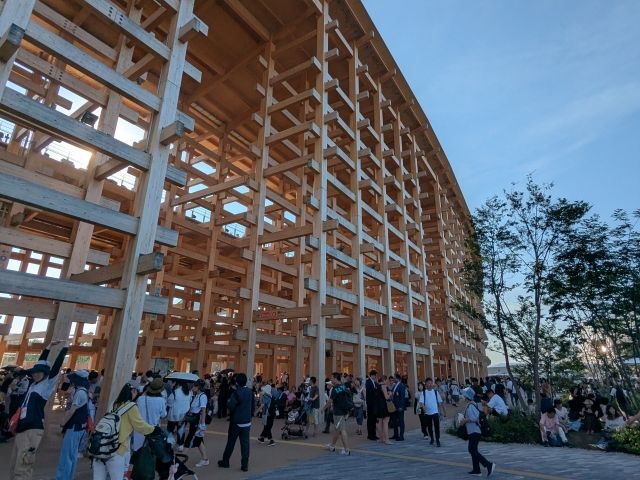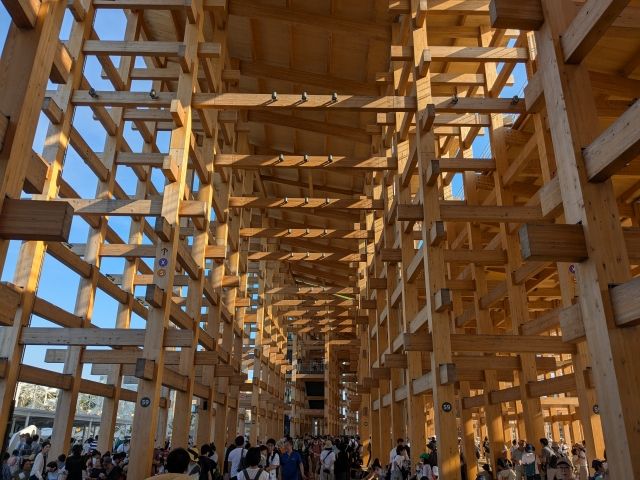まずは大屋根リングを通過。思っていたよりもはるかに大きな木造建造物。いったん上に登って全体を見渡そうかとも思ったのですが、日差しが強すぎるので却下。