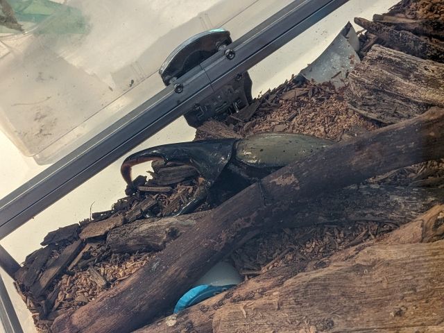 もちろん生きている昆虫の姿も見ることができます。人気なのはカブトムシやクワガタ。立派な角を持つヘラクレスオオカブトも飼育されていました。