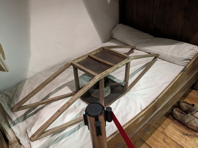 ちょっとした解説も置かれているため、それぞれの道具の用途もわかりやすいです。ベッドに置かれている謎の木型のようなものは、寝る前に炭火を使ってベッドを温めておくためのアンカであるそう。
