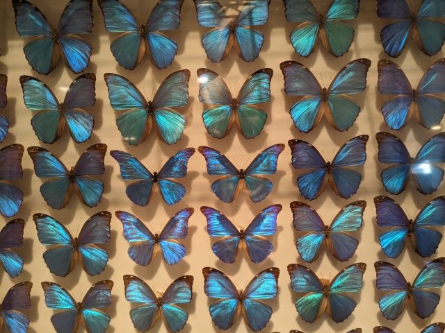 ずらりと並んだ多数の昆虫標本。びっしりと並ぶモルフォ蝶は、光を反射して美しいブルーに輝きます。よく見ると羽のカタチや色合いが少しずつ異なっています。