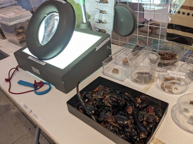 レンズとライトで昆虫の体を拡大して観察できるコーナーも。まるでおもちゃのように箱に詰まっているのは、甲虫の亡骸。ちょっとだけドキッとします。