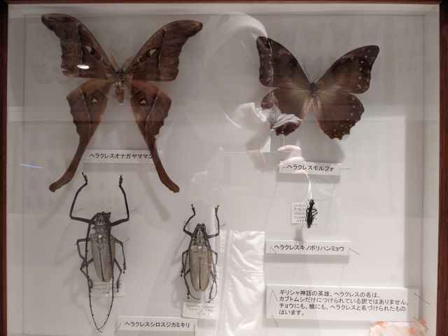 こちらはヘラクレスオナガヤママユ、ヘラクレスモルフォ、ヘラクレスシロスジカミキリ、ヘラクレスキノボリハンミョウ・・・。まさかのヘラクレスシリーズ大集合!ギリシャ神話の英雄の名を冠した昆虫は、オオカブトだけじゃないんですね。