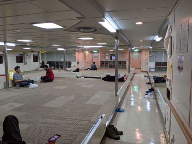 ちなみに2等席ってどんな感じ?気になる方のためにこちらが2等席。文字通り大広間タイプの雑魚寝です。繁忙期にはこれが埋まってしまうというのだから驚きです。また、降り忘れ防止のため壱岐エリアと対馬エリアに分かれています。