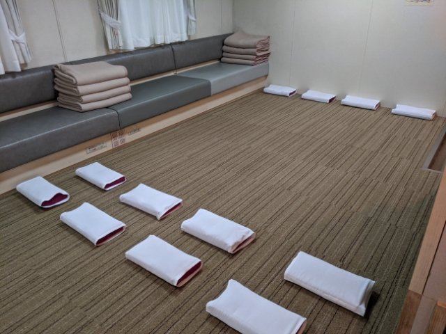 1等は個室、2等は雑魚寝タイプ。2等指定ってなんだろう?尋ねてみたところ、「2等は広間で完全に雑魚寝、2等指定は一人分の区画が用意された雑魚寝」とのこと。通常時はあまり差が無さそうですが、お盆などの繁忙期は2等は恐ろしいほど混雑し、隣の人とほぼゼロ距離になってしまうこともあるそうです。