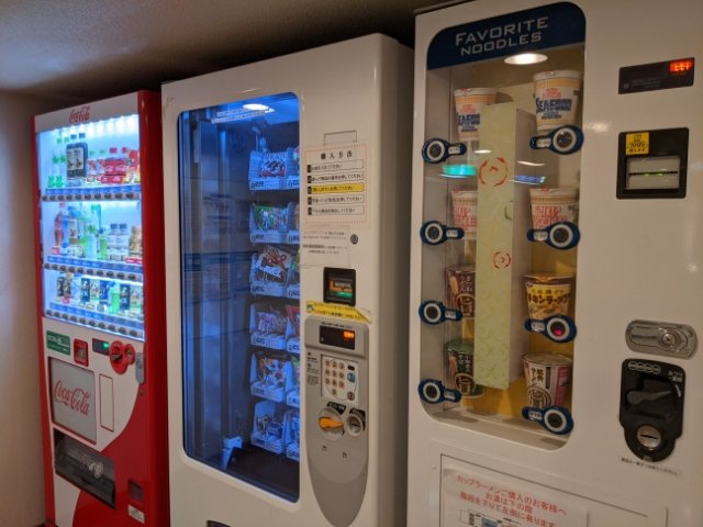 船内の自販機は飲み物に加えて、カップヌードル、パン、お菓子もあります。お腹が空いても何とかなります。