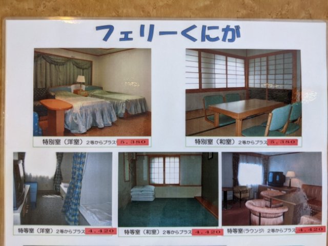 2等以上は特2等4,520円、1等6,360円と続きますが、2等と同様に雑魚寝スタイルのようです。その上の特等7,930円と特別室8,890円は和室と洋室がそろった個室となるので、ラグジュアリーな船旅が楽しめそうですね。