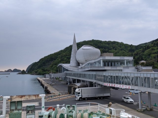 フェリーくにがの乗船場となる島根県松江市の七類港。めっちゃインパクトある外観の隠岐汽船ターミナルは「メテオプラザ」という施設で、売店やお風呂、かつて美保関へと落下した隕石展示施設メテオミュージアムなどが入っています。