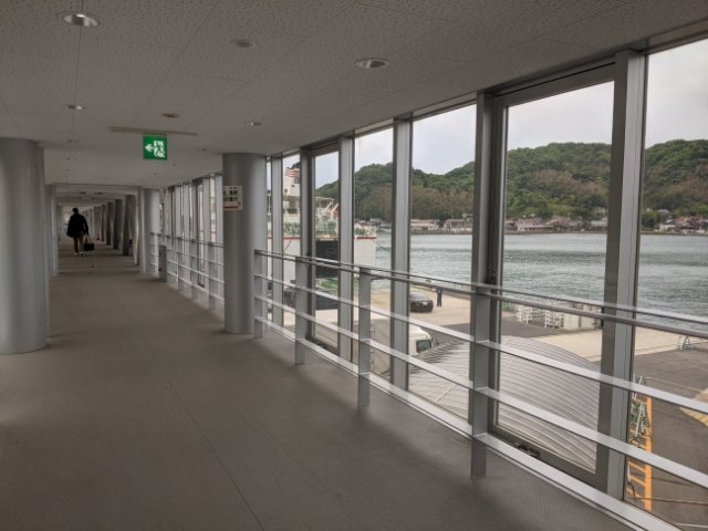 エスカレーターで2階へ登ると、フェリー乗船口までタラップが続いています。屋外に出ることなく船に乗れるのはありがたいです。