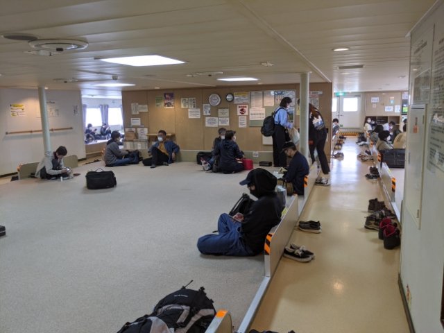 船内ではゴザの貸し出しも行っており、通路などで寝転がって過ごすこともできます。座る席が無いほど混雑したとき用かと思いきや、座席には余裕がある状況でも利用している人がけっこういました。