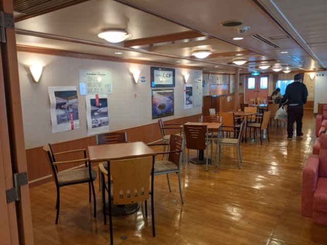 上のフロアには2等席のラウンジもあります。テーブル席もあるので、食事やパソコン作業するときはこちらがおすすめ。船内図を見る限り、かつてはレストランであった場所のようです。