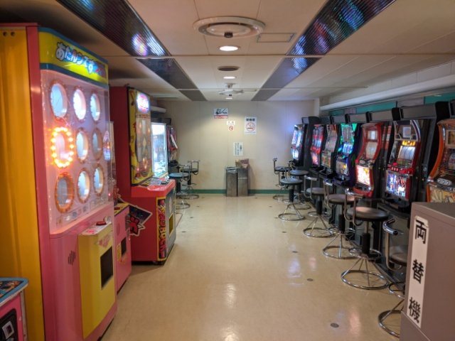 ゲームコーナーが意外と広い!スロットやクレーンなど、今のゲーセンでは見かけないようなレトロなラインナップ。利用している人はいませんでしが、これを楽しみにしてる人もいるのでしょうかね。