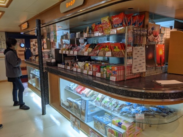 売店では、お菓子や飲み物、パン、カップヌードルなどを販売。隠岐民謡のCDや隠岐のおみやげもちょっとだけあります。この売店は、島前〜島後間は閉店しているようなので御注意を。本土〜隠岐間ではずっとやってました。