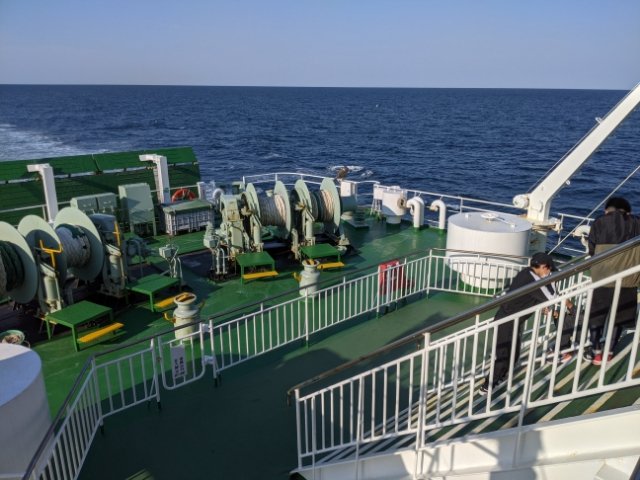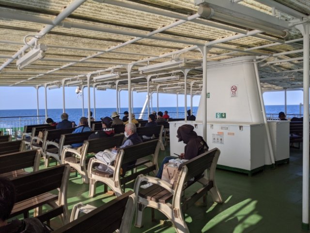 屋外デッキは船体後方がメイン。前方の景色を見ることができる場所は無く、基本的には航跡波を眺めて過ごす感じです。