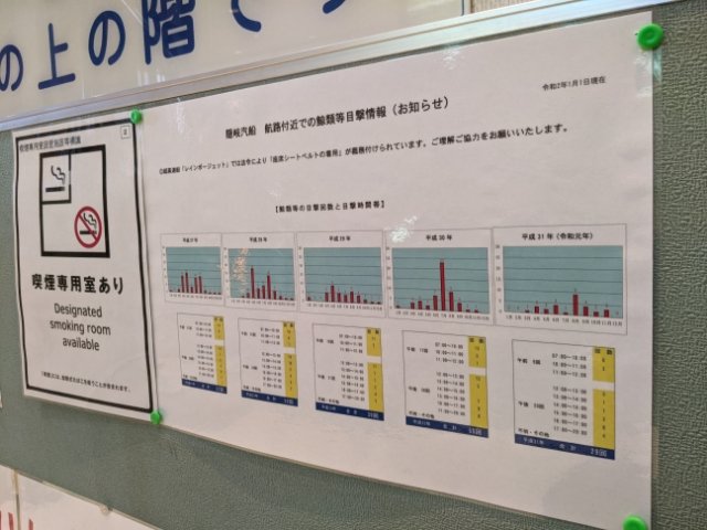 こちらはクジラの目撃情報。令和元年で29回、平成30年で55回も!グラフを見る限りでは7〜8月が多いようです。夏場に乗る方は、クジラ探しチャレンジしてみては。