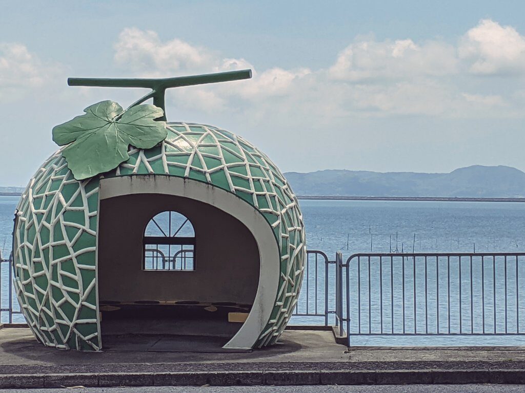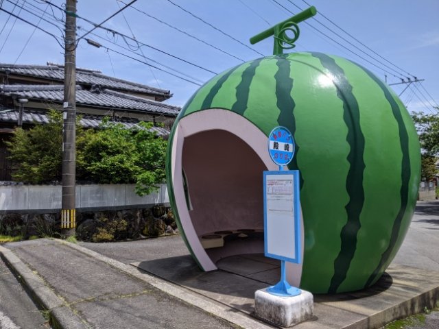 フルーツバス停は全部で16基あるそうですが、フルーツの種類はスイカ・メロン・ミカン・イチゴ・トマトの全5種類。いずれもディティールがしっかりと作り込まれているため、見ごたえがあります。