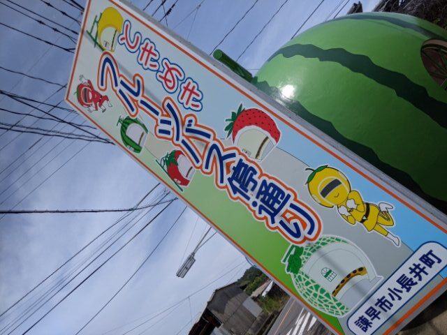 なお、フルーツバス停がある道路の愛称は「ときめきフルーツバス停通り」と呼ばれています。道には看板が立てられており、戦隊もののようなキャラクターも描かれています。