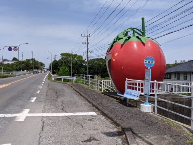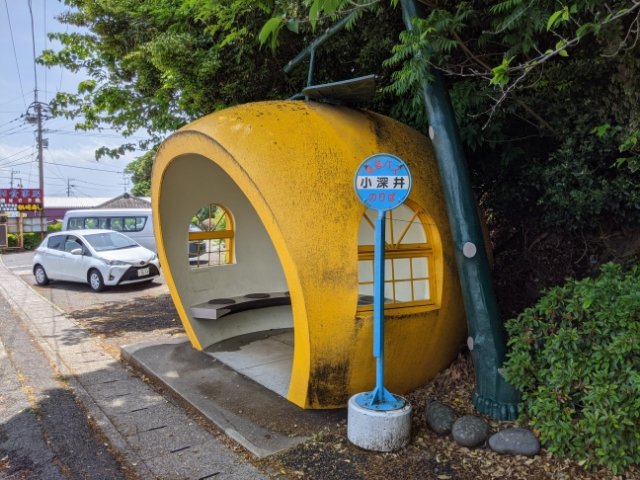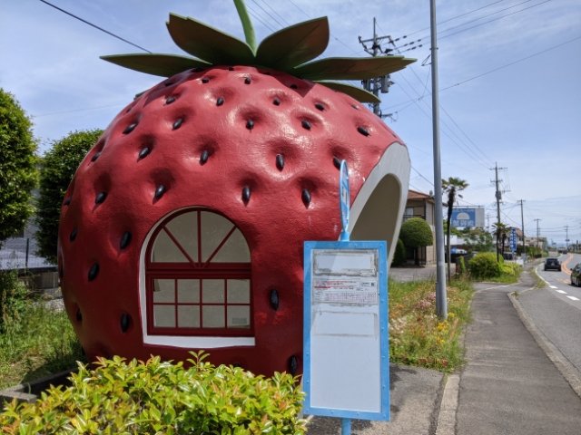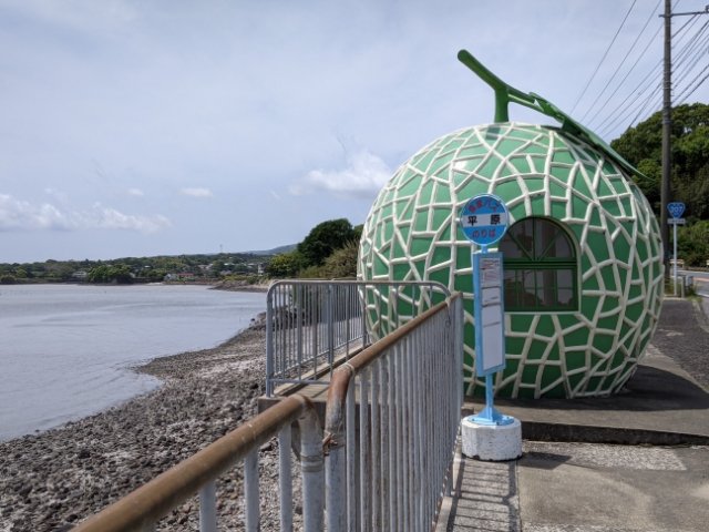 国道207号線沿いに突如現れるフルーツ。まるでテーマパークのような演出ですが、こちらはバス停の待合室。その見た目通り「フルーツバス停」という名で呼ばれています。