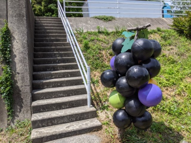 フルーツバス停は5種類ですが、バス停《小深井》のトマトの後ろにブドウを見つけてしまいました。浮き玉を組み合わせてできているのですが、しっかりとヘタと葉が付けられています。