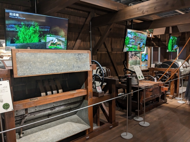 乾燥させながらかき上げる「粗揉機」、揉み出す「揉捻機」など手揉みの動作を再現するために造られた一連の「製茶機械」もずらり。モニターでは実際に稼働している様子、さらに人の手の動きとの比較もできるようになってます。繊細な動きをする機械の映像はずっと見ていられます。