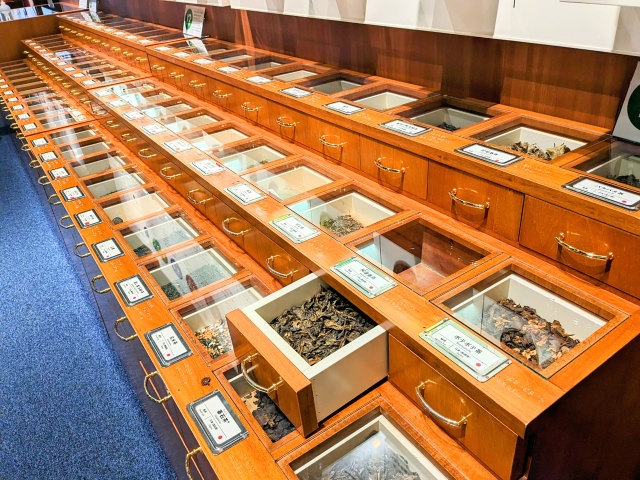 ずらりと並んだ世界のお茶。緑茶、青茶、紅茶、白茶、黄茶、黒茶という酸化発酵の違いによる六大分類がサンプルつきで展示されています。