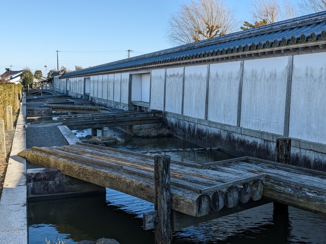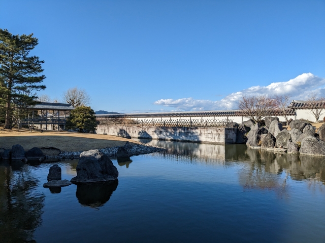 築地塀の向こうには8つの橋が架かっております。よく見ると橋のデザインが全て異なっており、それぞれ名前が付けられています。この橋は伊勢物語にちなんでいるそう。