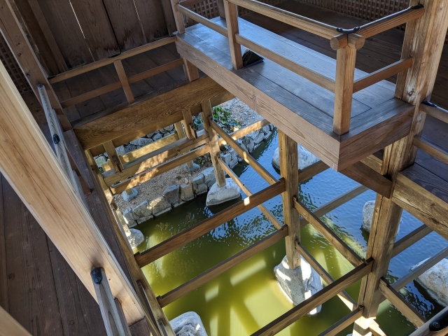 真ん中が空いており、水を湛えた姿を内部から眺めることができます。多数のお茶を見た後だと、グリーンの水は抹茶にしか見えません。