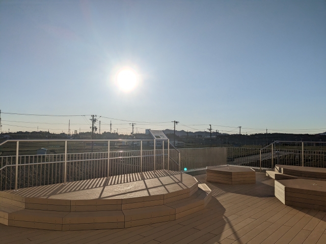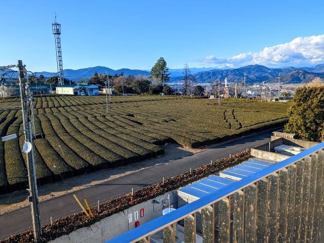 3階に造られた牧之原大茶園展望テラス。ここからは牧之原台地の広大な茶畑を見渡すことができます。開放的なウッドデッキでは、座布団も利用可能。天気が良い日は、ここでのんびりするのも良さそうです。