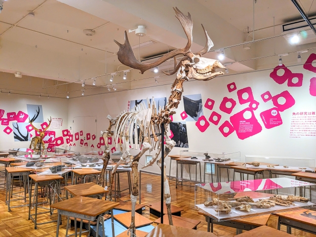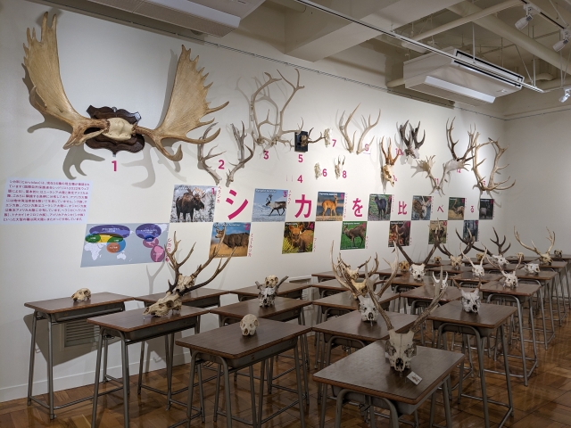 タイトルが示す通り、現代においても身近な野生動物であるシカをテーマにした内容。シカの進化の歴史を表した展示では、長い年月をかけて進化した結果、徐々にツノが大きく立派になっていく様子が体感できます。