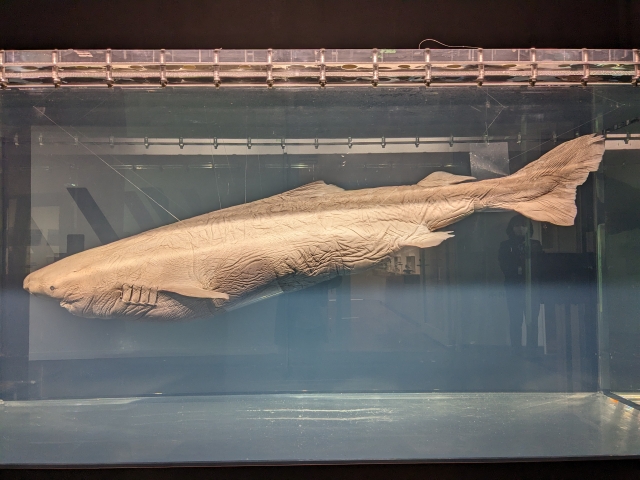 廊下には2016年に駿河湾の漁師さんが釣り上げたというオンデンザメの標本。全長2.8mという大きさですが、まだまだ子供。最大で7mにもなり、年齢は500歳まで生きることもあるというびっくりなサメです。イカやカニ、海底の遺体などを食べるため、サメなのに鋭い歯はありません。正面にまわると、特徴的な口の中の様子も見ることができます。