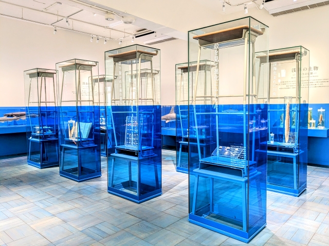 展示室3「ふじのくにの海」は、学習机を積み重ねた展示方法がインパクト抜群!ここに並べられているのは、たくさんの海の生物の標本。記載されている展示も、「縄文人も、グルメです」「ペリーとサンマ」など、とっつきやすく気になる内容ばかり。