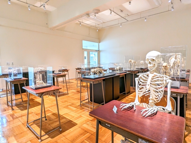 展示室8「生命のかたち」では、教室さながらに並んだ学習机。そこには様々な生き物の骨格標本が着席中!!並び順は名前の順ではなく、進化の順というのも面白い。教室の前に立つと、骨たちの先生になった気分です。
