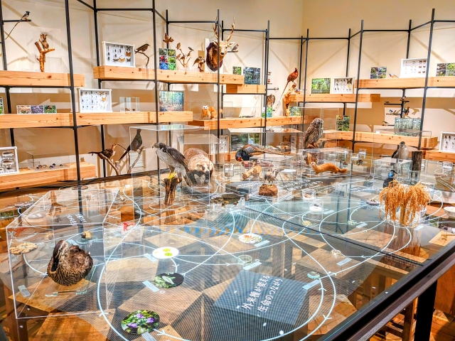 展示室4「ふじのくにの大地」では、海に続いて陸の生物。テーブルの上に置かれた剥製や標本たちは、白い矢印が結ばれています。これは里山生態系の食物連鎖を表しています。矢印が全て一方的な「食物連鎖の頂点」を見つけると、ちょっとだけ嬉しい気分。大きい動物だけでなく、意外な頂点もいますよ・・・!