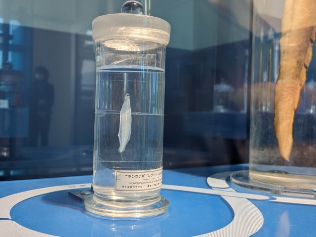 たしかに、剥製や標本もわりとポピュラーなラインナップ、かと思いきやニホンウナギのレプトケファルス(稚魚)を発見しました!これが展示してあるのはかなり珍しいのでは。