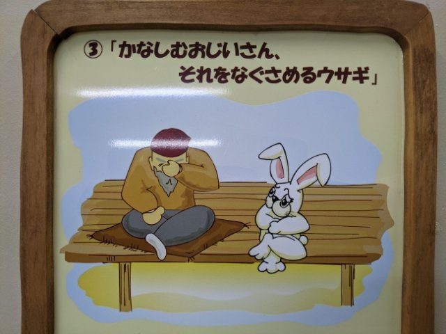 ロープウェイ乗り場の壁には、イラストとテキストでカチカチ山のストーリーが記されており、待っている間に眺めて楽しむことができます。