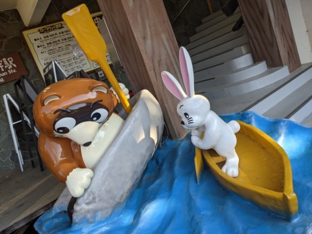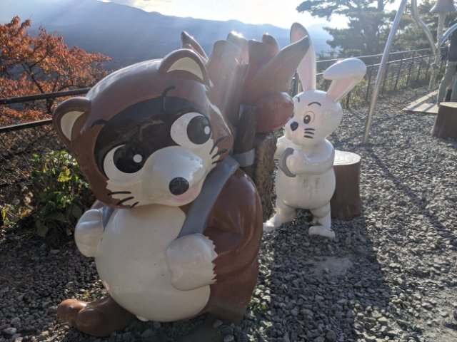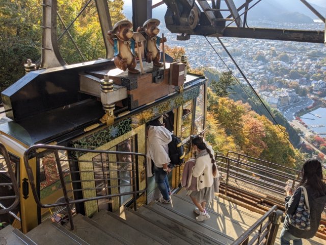 よく見ると、ゴンドラの上には2匹のタヌキが乗っかっています。日本各地に様々なデザインで100以上あるロープウェイですが、車体の上にまで装飾があるのってとってもレアじゃないでしょうか!?