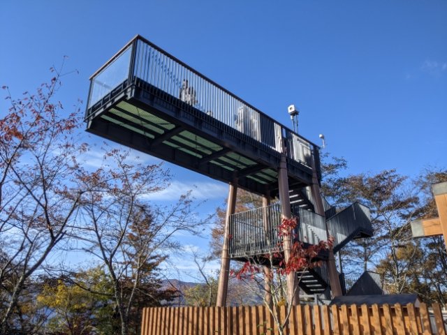 さらに奥地へと進んでいくと、謎の構造物が見えてきます。こちらは絶景やぐらと呼ばれる展望台。不安になるほどせり出した、インパクトのある展望施設です。