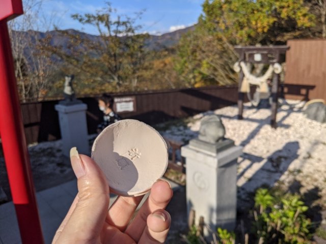 山上ではかわらけ投げも楽しめます。鳥居に下がる注連縄に入れば良縁にめぐまれ、さらに奥にある小さな鳥居に入るとありえないほどの縁にめぐまれるそう。かわらけは2枚100円にて販売中。