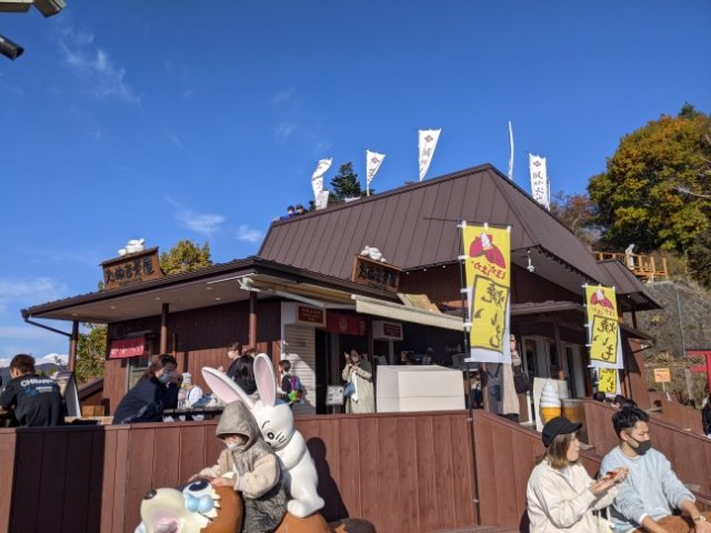 みたらしのたぬき団子、黒蜜きなこのうさぎ団子、動物の形をした最中の乗ったたぬきソフト・うさぎソフトなど、カチカチ山にちなんだメニューがたくさん。絶景を眺めながらひと休みができます。