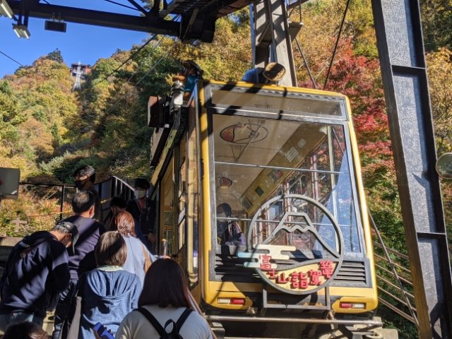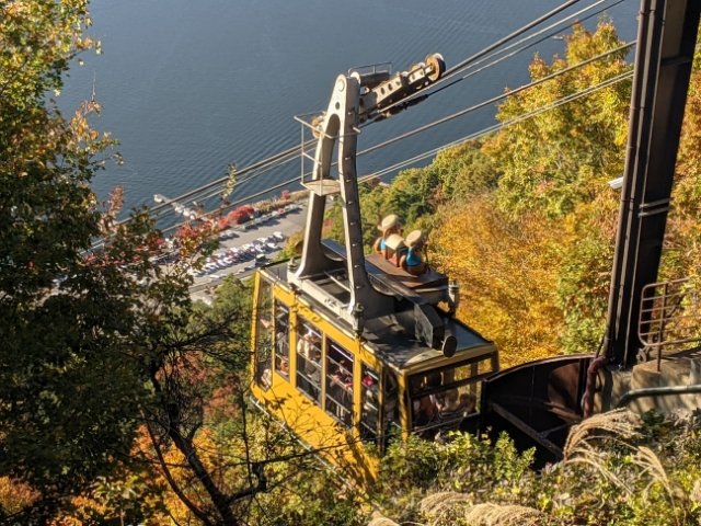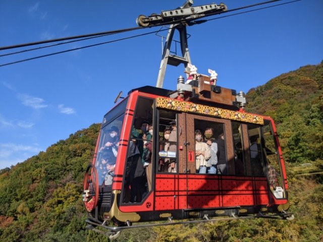 ロープウェイは高低差219mをわずか3分で一気に登ります。進み始めると、車内では和風でテンション高いBGMとともに、自動音声の観光案内が流れてきました。