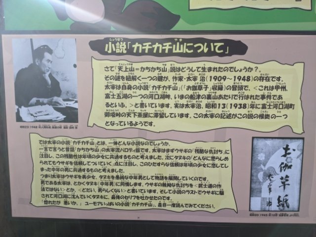 彼は「お伽草子」にてカチカチ山を新解釈にて書き直すのですが、物語の冒頭部分で原作の内容に触れる際、「これは甲州、富士五湖の一つの河口湖畔、いまの船津の裏山あたりで行はれた事件であるといふ。」という風に記載しています。ここから舞台は天上山ではないかと言われるようになったのです。